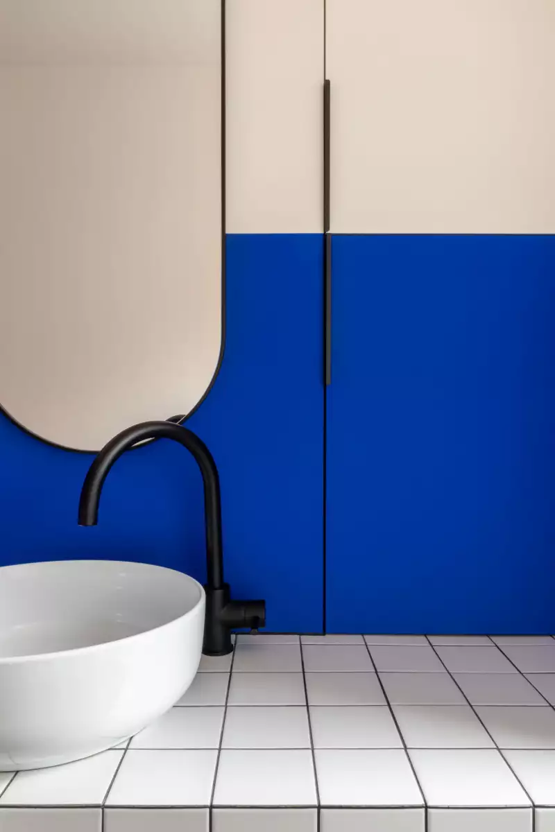 peinture de sol, contreplaqué bouleau, plâtre, pierre recyclée, acier brut structurel, carreaux de grès cérame et faïence blanche.